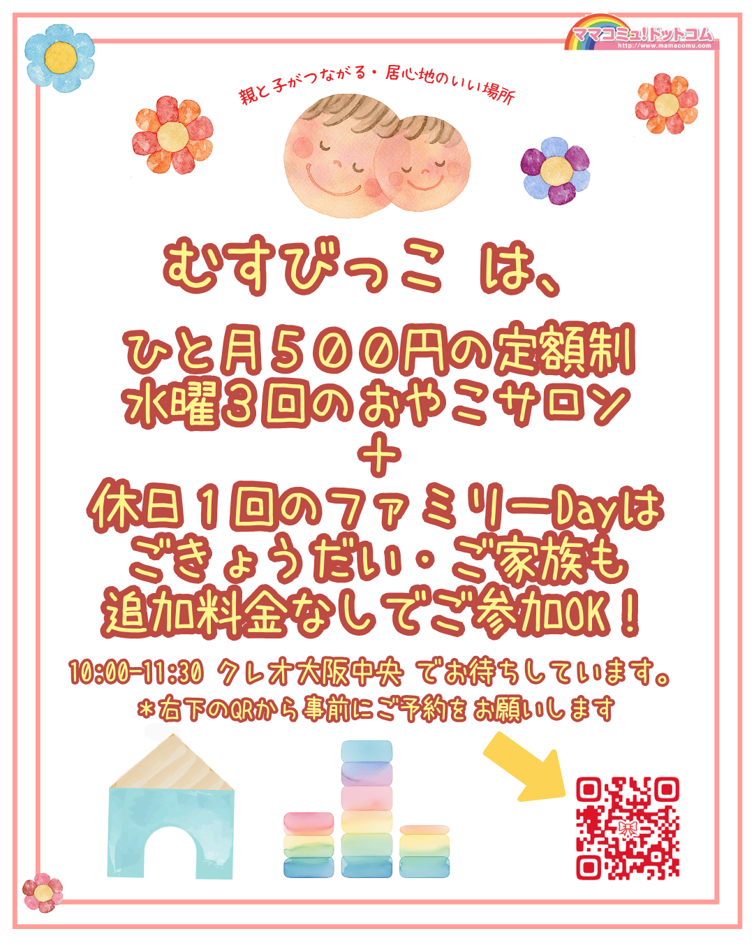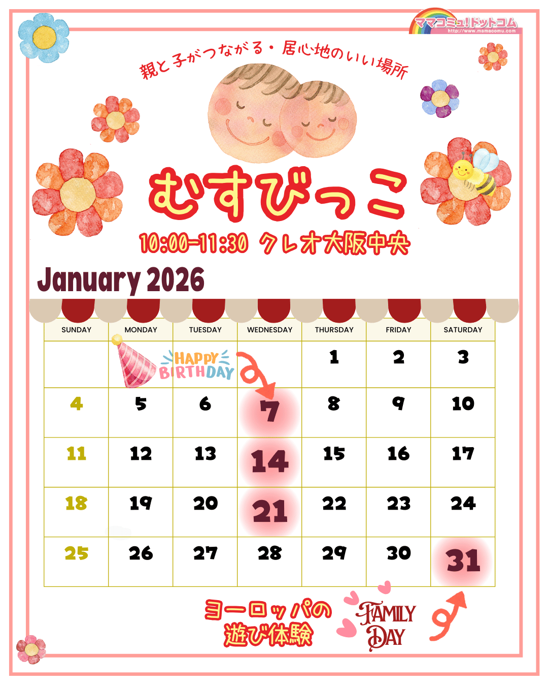 子育てする人が子連れでほっとできる居心地のいい場所「むすびっこ」が天王寺区のクレオ大阪中央にオープンします。